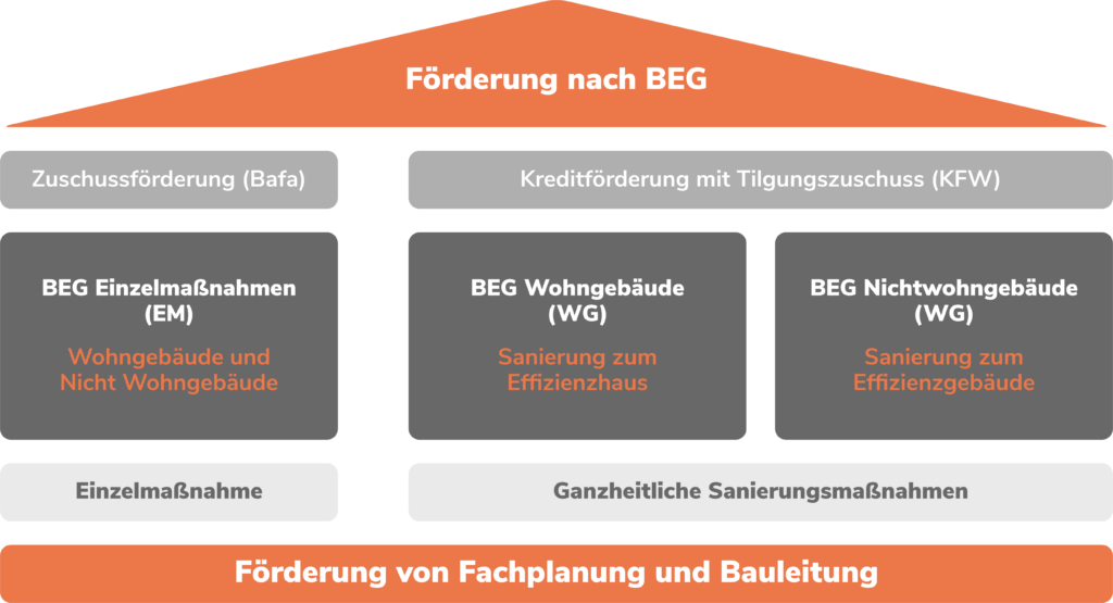 Es gibt eine Vielzahl an Förderungsmöglichkeiten für die energetische Sanierung von Gebäuden. Die Bundesförderung für effiziente Gebäude kurz BEG gliedert die Förderfähigen Maßnahmen in 3 Teilprogramm auf: